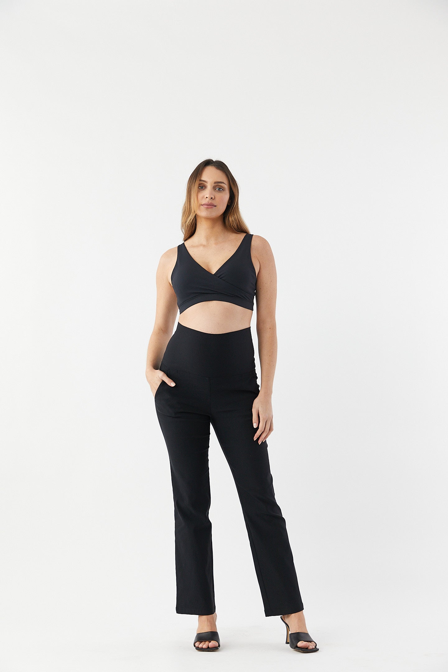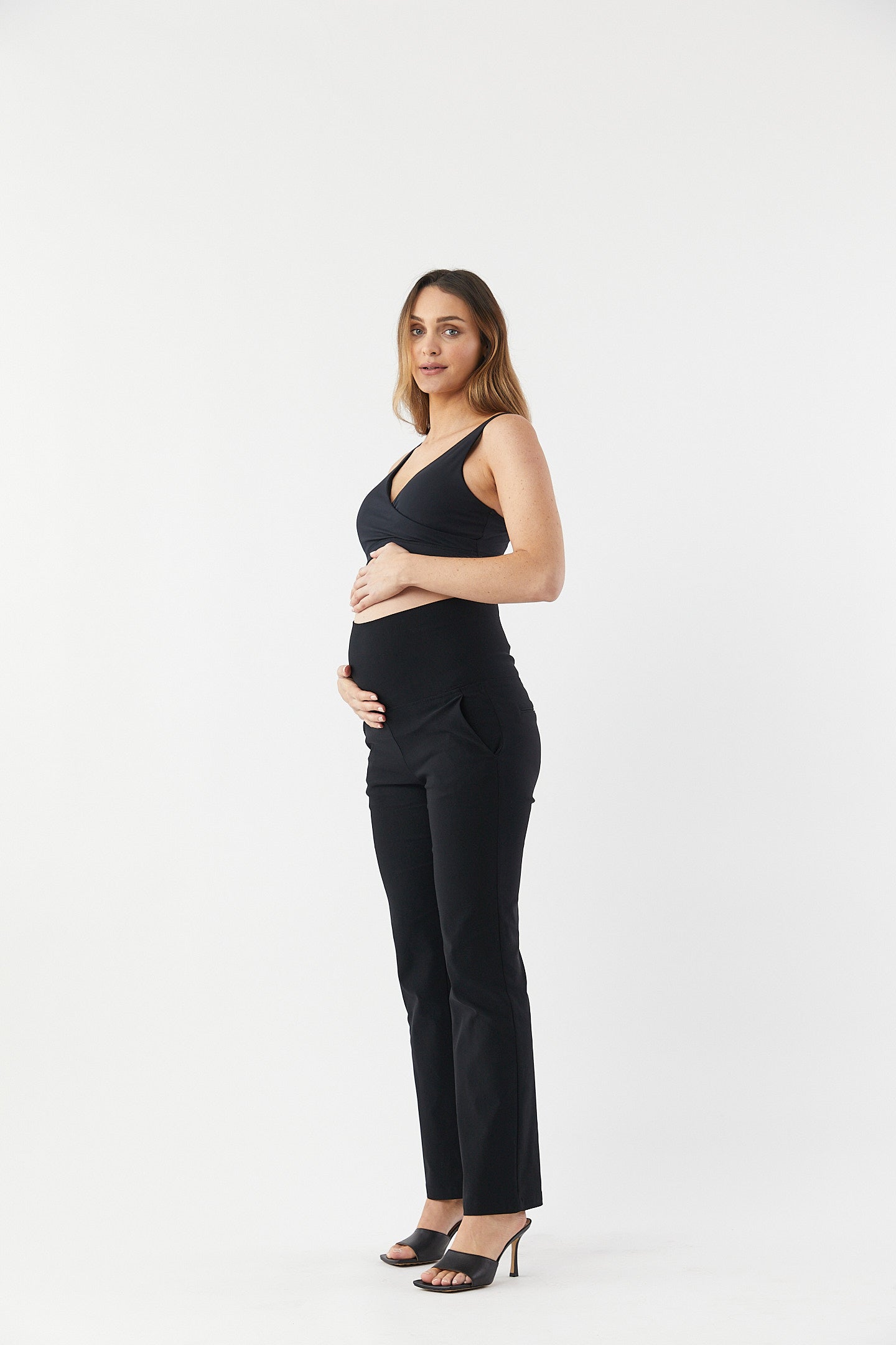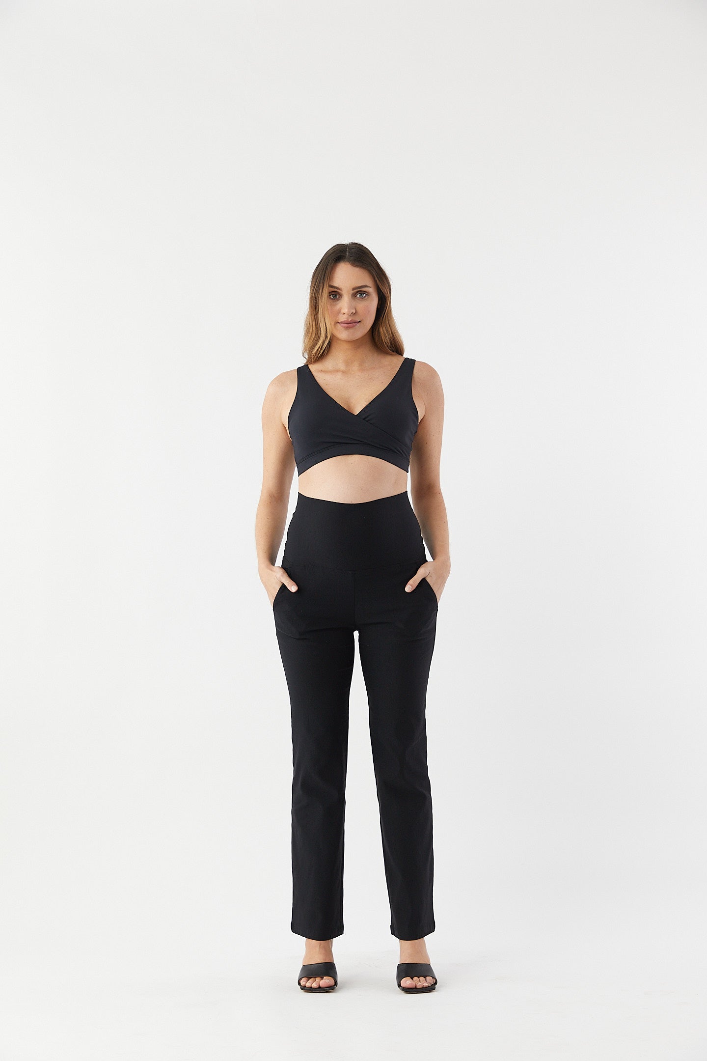 The overbelly waistband offers support and can also be folded down in the early stages of pregnancy and post-partum and they feature a slim/straight silhouette.