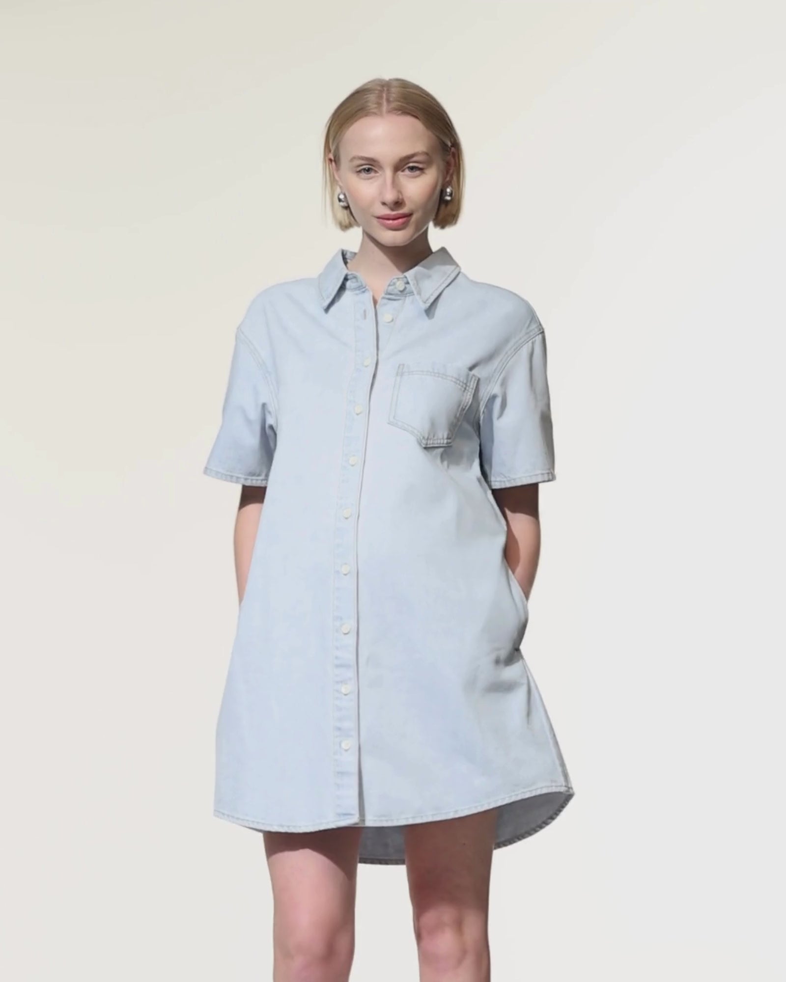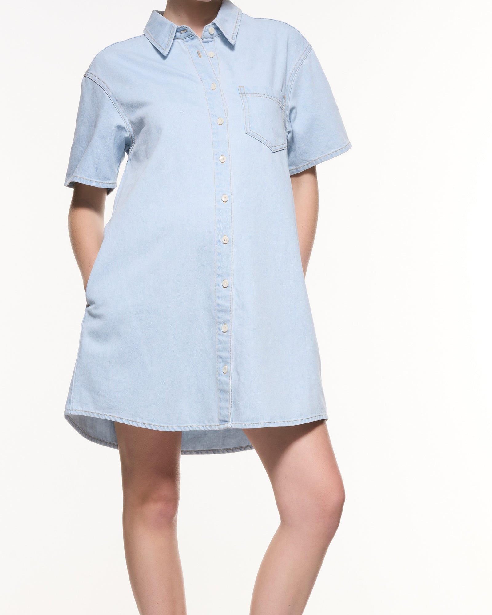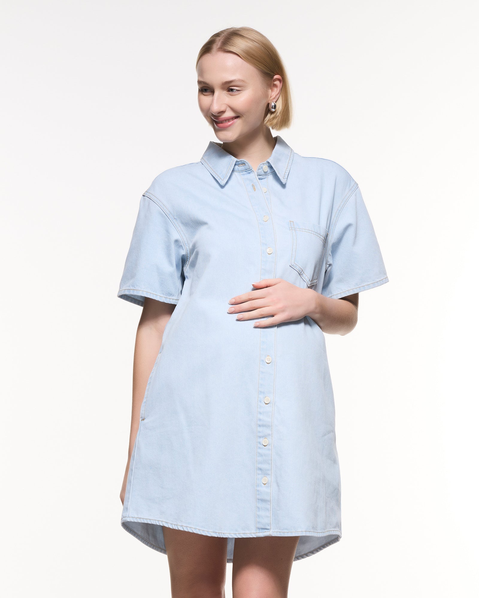 The Luna Denim Shirt Dress is a modern maternity essential designed for comfort and style from pregnancy to postpartum. Crafted in soft, lightweight denim, it features a relaxed silhouette, curved hemline, and a full button-down front for easy nursing access. Perfect for everyday wear, it can be styled effortlessly with sneakers or boots for a polished yet relaxed look